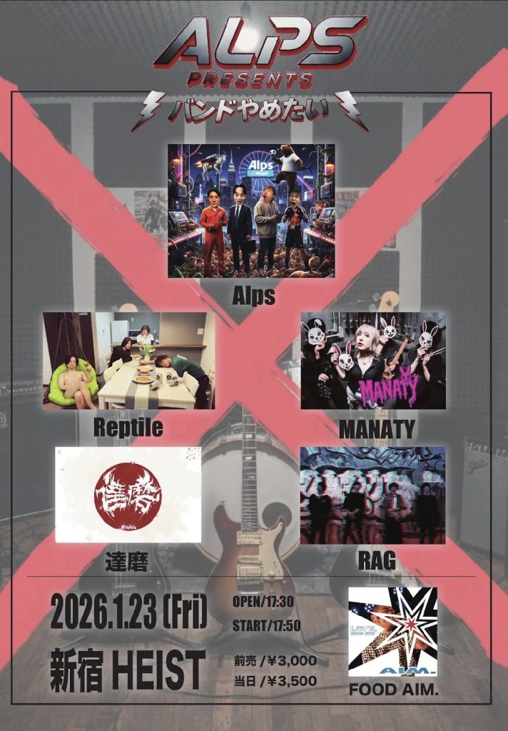 【東京】2026年1月23日(金)新宿HEIST SCHEDULEScreenshot X Facebook コピー 2026.01.11 Screenshot Alps pre. 「バンド辞めたい」 目次 日程会場出演時間チケット 日程 2026年1月23日(金) 会場 新宿HEIST 出演 Alps Reptile MANATY RAG(一夜限り復活) 達磨 Food AIM. 時間 OPEN / START:17:00 / 17:30 Reptile 19:50〜 チケット 前売 3,000円 当日 3,500円 チケット予約 アーティスト予約/当日券 ご予約のお名前と枚数をメールまたはSNS DMまでご連絡ください。